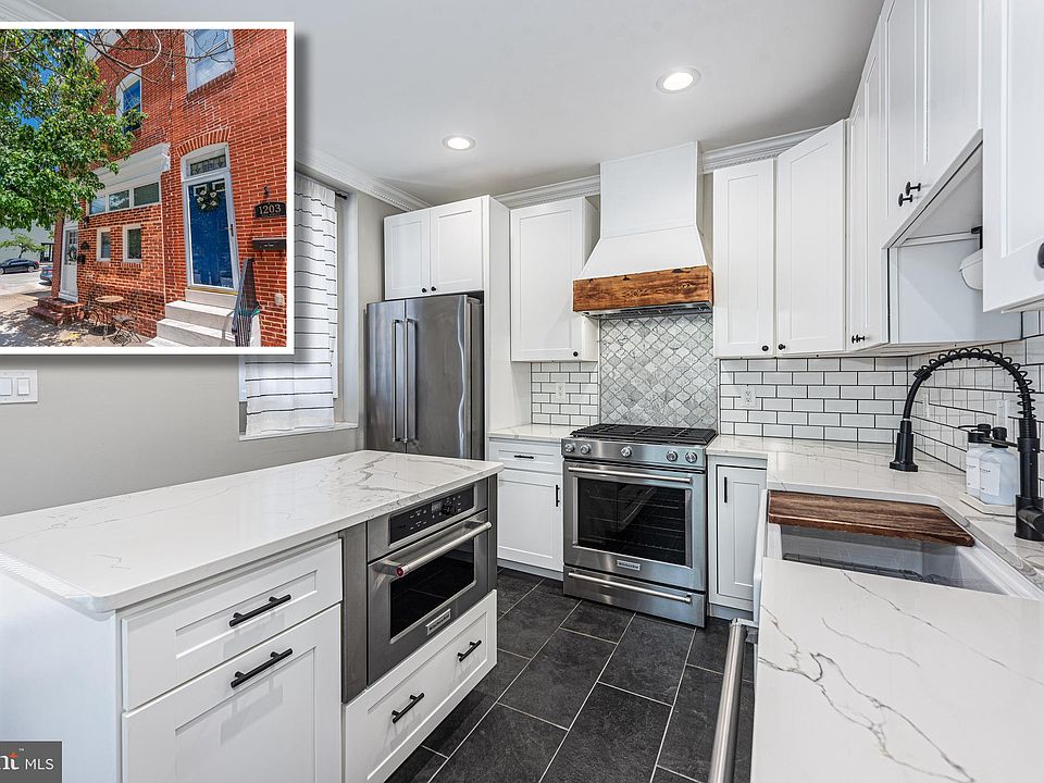 BEYOND SPECTACULAR END OF GROUP RENOVATION WITH A ROOFTOP DECK AND OFF STREET PARKING! Welcome to your dream home! This home perfectly blends modern luxury and thoughtful design and features 11 ft. ceilings, hardwood floors, and exposed brick throughout, a designer island kitchen with a large island, Quartz counters, and a premium Kitchen Aid appliance package, a convenient main level half bath, upper level with 2 bedroom suites including a Primary bedroom suite with a luxury bath featuring a walk-in glass enclosed shower, double vanity, and heated floors, bedroom level laundry with new LG washer and dryer, a finished basement with 2 additional bedrooms and a full bath with heated floors, a 2nd level rear deck which leads to the rooftop deck with sweeping views of the Harbor, Domino Sugar sign, & Silo Point, and convenient off street parking! There are thoughtful details throughout this home including smart lighting throughout, energy certification through BGE, all new windows, a custom coffee/dry bar with a wine fridge, and a new roof and rooftop deck. Convenient location - close to restaurants, shopping, and a quick commute to major roadways. This is city living at it's best!