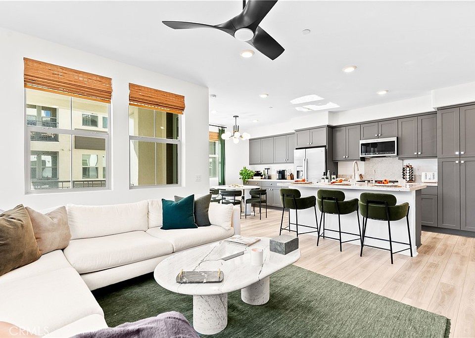 Discover your dream two-bedroom home in the heart of Rancho Mission Viejo, where resort-style living and modern design come together in perfect harmony! This highly desirable end unit is drenched in natural light and offers a spacious, open-concept layout with elegant laminate wood flooring throughout. The chef-inspired kitchen is the heart of the home, showcasing stainless steel appliances, a sleek five-burner gas stove, quartz countertops, a center island with bar seating, and thoughtfully upgraded cabinetry with added storage and a purified waterspout. Designed for comfort and convenience, the entire living space is located on one level, including the serene primary suite that features a generous walk-in closet and a spa-like ensuite bath with dual sinks and designer finishes. The second bedroom is equally serine, ideal for use as a guest room, home office, or cozy den, with its own full bathroom with tub. Step outside onto your private terrace to enjoy mountain views and seamless indoor-outdoor living, make it perfect for morning coffee or evening sunsets. This turnkey residence includes state-of-the-art upgrades such as a whole-home water softener system, tankless water heater, ring doorbell and security system, smart home features, Moen flow smart water leak detector, electric car charging station, double-pane windows, a four-year extended appliance warranty, and a fully PAID OFF SOLAR SYSTEM. With an attached one-car garage that offers additional storage and Energy Star efficiency throughout, this home combines luxury with smart, sustainable living. As a resident of Rancho Mission Viejo, you’ll enjoy access to a vibrant lifestyle that includes resort-style pools, state-of-the-art fitness centers, scenic walking trails, community farms, and a variety of recreational options like bocce ball, tennis, pickleball, clubhouses, playgrounds, and even a neighborhood coffee shop and arcade—making every day feel like a vacation.