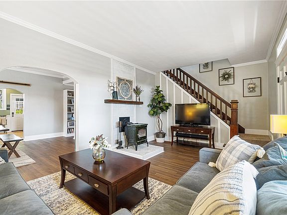 This three-bedroom two-bath home has charm in every corner. Beautiful landscaping and an inviting front porch greet you as you approach the home. A wood stove centers the living room which features new engineered hardwood floors, stained glass windows, and a white-washed accent wall. The dining room features a new chandelier and opens to the den, framed by built-ins and the perfect space to cozy up with a book or for a few cocktails with friends. A barn door leads to the classic farmhouse kitchen with white cabinets, butcher block counters, black accents, and stainless steel appliances. Out back, a large patio is a perfect entertaining space and the large yard can accommodate anything you imagine! Upstairs are three spacious bedrooms and a classic black and white tiled bathroom with walk-in shower and soaking tub. The finished lower level has plenty of space for a play or exercise room. It is completed by a second full bath. New roof 2019, new garage 2020.