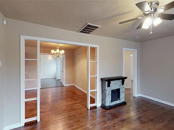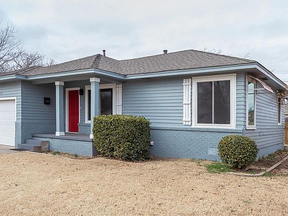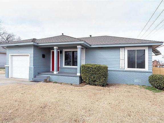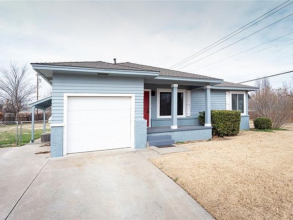Adorable remodeled home in OKC! This charming home, built in 1950, sits on a large corner lot with great curb appeal, including new paint, shutters, columns & a new expanded driveway. From the inviting porch you enter the home & see the gorgeous refinished hardwood floors & new interior paint throughout. The living room features an electric fireplace that stays with the house & can be positioned wherever you'd like. The wood floors continue into the dining room with a beautiful chandelier. The updated kitchen includes new tile, granite counters, subway tile backsplash, sink & faucet. French doors lead into the master with wall sconces, another electric fireplace & access to the full-size indoor laundry room. Two more bedrooms & the bathroom are located off the living. The bath is updated with new tile, vanity & mirror. Other updates include new ceiling fans, new roof & water heater in 2018, new sewer line in 2016, updated windows & some new fencing. See the Matterport tour!