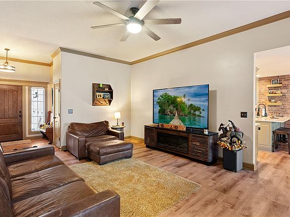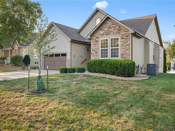 Welcome to this stunning 4-bedroom, 3-bath home in the highly sought-after, maintenance-provided community in Greenwood, Missouri—proudly recognized as the second safest city in Missouri in 2023. This home boasts impressive updates throughout, including all-new landscaping and stylish new light fixtures. The kitchen is a true showstopper, featuring a new brick backsplash and a striking focal wall, complemented by a natural wood ceiling inlay, new quartz countertops, a modern sink, and a sleek faucet. The bathrooms have been equally upgraded with new quartz countertops, sinks, and faucets. Enjoy peace of mind with a brand-new furnace and air conditioner installed in winter 2023-2024, as well as tinted north-facing windows for energy efficiency, including the downstairs bedroom. The spacious master bedroom also features a beautiful natural wood ceiling inlay, adding a touch of warmth and elegance. Additional upgrades in 2023 include a new blower for the fireplace, a new garage door opener, and a new sprinkler controller. All kitchen appliances, updated between 2023 and 2024, stay with the property. This home perfectly blends modern amenities, thoughtful updates, and a prime location—don’t miss the chance to make it yours!