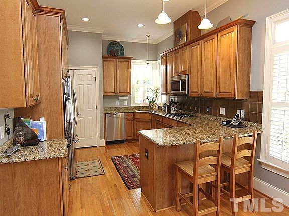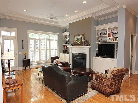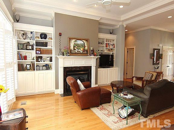 Pristine Meadowmont Home w/wraparound porch on large corner lot w/private fenced rear retreat! First floor master suite w/trey ceiling/garden tub/sep shower/huge walk-in closet, family room w/fireplace/gas logs/built-ins. custom kitchen cabinets/granite countertops/SS appliances/tile backsplash, formal dining room plus breakfast area, 1st fl utility/mud room, large bedrooms/huge bonus room, walk-in attic storage, 2-car garage. New ext paint, lots of hardwood flrs. Extensive landscaping/irrigation system.
