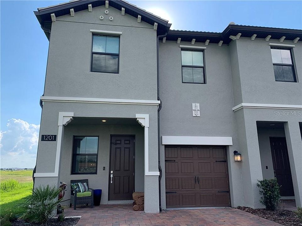 This beautiful three bedroom, two and a half bath luxury townhome features upgrades galore! End unit brings natural light and panoramic view of sunrise over the water, the green on the first hole on Champions Gate National Golf Course, sunsets from the pergola. Situated on a premium lot in a desirable gated, maintenance provided community with a plethora of amenities including access to multiple resort style swimming pools, hot tubs, lazy river, game rooms, golf simulation, theater room, fitness centers and more. Kitchen boasts beautifully upgraded espresso cabinetry with crown molding, quartz countertops, large center island and top of the line appliances including double oven glass top range and refrigerator with built in coffee maker. Owners' suite includes large closet, remote controlled window treatment to maximize view and light, and private bath with double vanity. Two additional bedrooms, one of which includes custom murphy bed to maximize space. Unique to this floorplan is a loft with spectacular view, perfect for office, den or play area. Garage features built in storage. Ideal for primary residence or as your vacation home. This property is truly one of a kind. Whether you are looking for resort style living with a spectacular view, privacy, natural light, or golf front lot, this must see property has it all. Schedule your tour today.