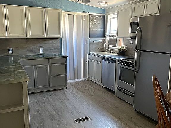 *Owner Carry Option with $45,000 down** Well maintained and updated 3 room, 2-bathroom home with laundry room located on a corner lot with small shop, storage shed and great backyard. Located in Redmond, Oregon and in one of the most reasonably priced parks that allows dogs and walking distance to Vern Patrick Elementary School. This home features a great room design, light and bright with skylights, large living room, a breakfast bar and acrylic countertops. The kitchen is spacious, has several built-in areas, a nice dining area, and comes equipped with a stainless-steel oven/microwave and dishwasher. The living room has a great built-in entertainment center, vaulted ceilings and a primary separation layout that gives this home an ideal layout. The primary bedroom has a walk-in closet and a large bathroom. The guest rooms are both spacious and share a nice guest bathroom. The backyard is fully fenced and features expansive raised planter beds, a large wooden deck, a storage shed, and a separately enclosed and graveled dog run. There are 2 parking spaces and the corner lot offers street parking.