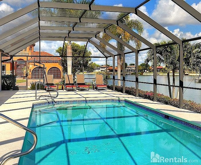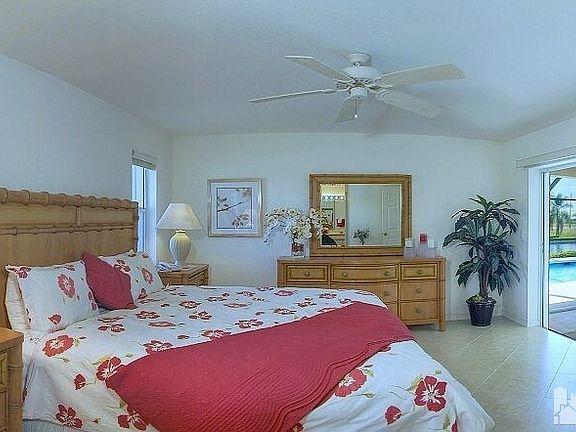 ** Beautiful freshwater home **Lake views **Privacy on oversized lot **Built 1999 **1,685 square feet of living area **3 bedrooms (K, Q, T) **2 bathrooms (one is also a pool bath) **Large swimming pool with double heating system! **Dock on the water for fishing and sunbathing. Fully furnished and equipped, for example **Air conditioning **Refridgerator/icemaker **Washer **Dryer **Dishwasher **Range **Microwave **Phone and Fax (card needed for long distance) **High Speed INTERNET connection **4 TV sets (cable), Big-Screen tv in living room **DVD, VCR, stereo **BBQ grill **Linens, towels etc. **2-car-garage (one to use) **Residential neighborhood without through traffic** tiled throughout** granite counter in kitchen
