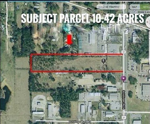This Prime Commercial land has 360 LF on Schillinger Road, North and is 1260 LF deep. The land is flat and ready for development into a strip center or multi-family housing. This property is part of a total 14.32 acre property with a separate MLS listing for the office and warehouse building with 3.90 acres and is listed for $860,000.
