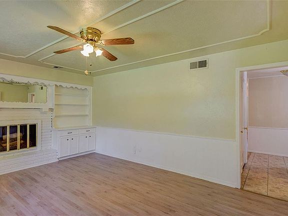 freshly painted inside & out, newer flooring through the entire house, what a great solid brick home buy in the heart of Midwest City. Inside, the home has a nicely sized eat-in kitchen with French doors opening to the open patio out back. A great view can be had as the house backs up to a greenbelt area, so no neighbors behind you. The Home has painted woodwork inside with a painted brick fireplace in the living area. Built-in bookcase flank both sides of the fireplace. The appliances all stay including the refrigerator! Where can you find a 3bd/2ba/2 car garage home under 100K? Take a look it's ready for the next family!