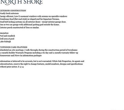 NEW CONSTRUCTION! Coming soon to Centennial Campus, North Shore will feature all brick townhomes with 2 bed and 2.5 bath. This end unit will feature open concept floor plan in living/kitchen area w/separate Den! Kitchen has granite counters & GE S.S. appliances. Large Master Bedroom with tons of natural light! Master bath w/large W.I.C, linen closet, double vanities & tiled shower. 1 car garage w/covered parking for 2nd car. Comm pool & trails!