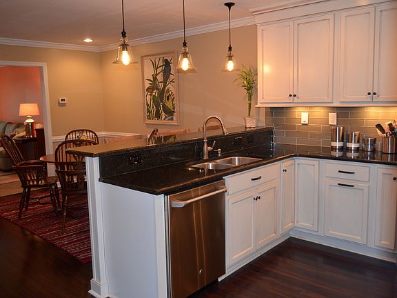 This lovely town-home, situated on a corner lot shaded by mature trees, offers three bedrooms, 3 1/2 baths, family room with fireplace, fenced rear deck, main level laundry, a finished lower level, and 2 car garage. The open kitchen is a real showplace with granite counter-tops and island, glass tile back-splash, custom cabinetry with a glazed tea-stained effect, pendant lighting and stainless GE appliances.