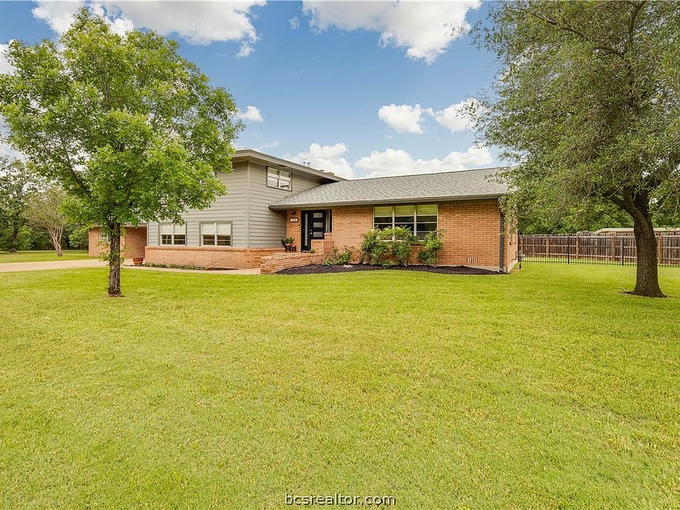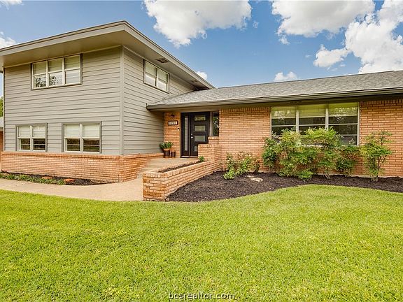 This historic home on .45 acres in The Knoll was built in 1957 for the Hervey family & was once the home of James B. “Dick” Hervey,6th Mayor of College Station. The modern prairie style displays both original architecture as well as diverse contemporary updates. The main floor features an expansive living room opening into a fully modernized kitchen that includes a formal dining area & an enormous “U” shaped quartz counter, white subway tile backsplash, playful display shelves, & recessed lighting. The sunken den includes pressed cork flooring & an impressive wood burning brick fireplace. Upstairs, the primary suite offers room for multiple beds & includes a wall of built-in cabinetry. The bathroom has modern updates w/ soaking tub, freestanding vanity, & stylish lighting. A second large suite also includes plenty of room for multiple beds & offers an en suite bathroom w/ tiled walk-in shower. Next to the downstairs den, two additional bedrooms share a hall bathroom w/ marble vanity & mosaic tiled shower w/ an invigorating shower panel system. Beyond the expansive carport that accommodates two SUVs is a cozy hideaway, suitable as an office, sports cave, or for climate-controlled storage. The spacious privacy fenced backyard w/ medium shade trees & a glorious lawn is large enough for any gathering. With so many rooms & just a 1.5 mile walk to Kyle Field, this home makes an ideal game day retreat. 294 SF flex space is not included in the 2,976 listed SF.