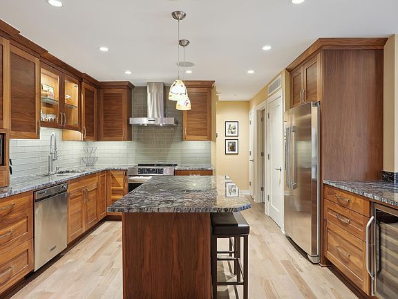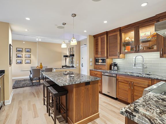 Downtown living at its finest. Completely renovated and reimagined open floor plan with spectacular downtown skyline views. Walnut cabinets, glass subway tile backsplash and granite countered kitchen with eat in center island and new convection, air fryer range. Adjacent formal dining area. Owner's suite has 12' walk in closet and convenient in-closet laundry. Bath features new tile floors, frameless shower door, and dual vanities with great storage. Loring Green's amenities are unsurpassed. Ask about 2nd garage stall.