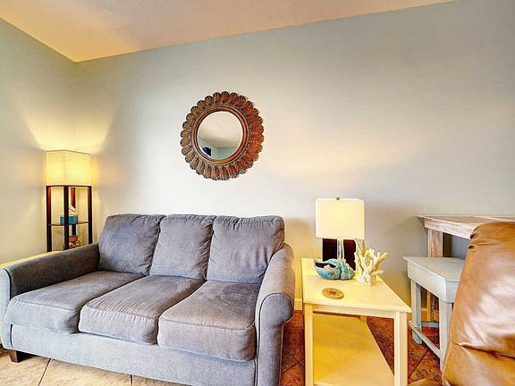 Fully furnished, Gulf front 2 bed, 2 bath condo at the desirable Sterling Reef Condos. This unit features an open living room, dining area and kitchen floor plan, making hosting a breeze. The open living room offers a stunning view of the water while relaxing indoors. The sliding glass doors in the living room lead to the private balcony overlooking the Gulf of Mexico, allowing you to immerse yourself in the warmth and serenity. The kitchen has plenty of cabinet space for storage, granite counters, and a kitchen island with a breakfast bar. The spacious master bedroom also offers direct views of the Gulf and also has sliding doors leading to the balcony. The private master bathroom features a shower/tub combo, linen closet and a large vanity. The guest bedroom is split from the master,