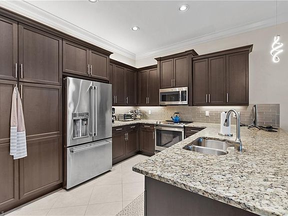 Marina Bay, extreme value buy! This move-in ready 2 bedrooms, 2 bathrooms, 2 car garage home features an open floor plan with diagonal tiles throughout and lots of impact windows/sliders making the home light-bright & sunny all year long! Just what you come to SWFL for. The kitchen has 42' wood cabinets, level 5 granite countertops, glass tiled backsplash, extended workspace and eat-at-bar. Formal dining room perfect for family gatherings. The master bedroom has tray ceilings, his and hers walk-in closet, dual sinks, & a walk-in tiled shower. The laundry room in residence has white wood cabinets for extra storage and a laundry tub. Extended screened paver lanai with lake views and paver driveway. Marina Bay has world-class amenities; resort-style pool, lap pool, splash zone, pickleball courts, Har-Tru tennis courts, full-size basketball court, fully equipped fitness center and more!