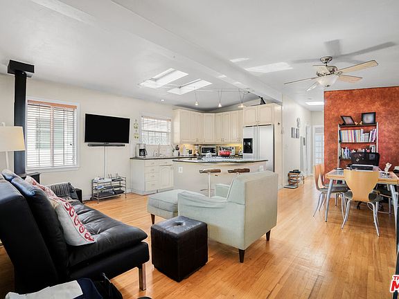 Don't miss your chance to own this charming Culver City bungalow, tucked behind a unique, storybook-style hedge and private gate. You'll instantly notice the character and privacy as you step past the spacious front yard with thriving banana trees, and into this cozy and inviting home. Inside, you're welcomed by an open living and dining area filled with natural light, further enhanced by two skylights above. A vintage cast-iron wood-burning fireplace serves as the centerpiece, creating an inviting spot to gather on cool evenings. The kitchen includes stainless steel appliances, granite countertops, a center island with breakfast bar, and ample cabinet space, while the dining area is finished with a ceiling fan to keep things comfortable year-round. The primary bedroom is a true retreat with doors that open directly to the backyard deck. The en-suite bathroom features a jacuzzi tub, the perfect place to unwind at the end of the day. A second bedroom and bath provide plenty of flexibility for family, guests, or a home office. Step outside to your own private redwood deck, an ideal setting to entertain, relax in a hammock, or enjoy al fresco dining. The detached garage with alley access has been converted into usable space with built-in storage and a stacked washer/dryer. An attached storage shed adds even more convenience. Perfectly situated near the Ballona Creek bike path, Playa Vista, Marina del Rey, and amazing shopping and dining, this home offers a rare blend of privacy, character, and location.
