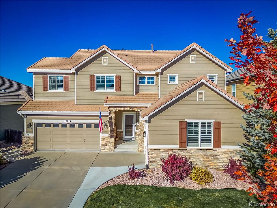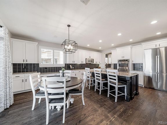 Come relish the unobstructed, million-dollar views of the entire front range, from Pikes Peak to Longs Peak, to DTC, past the City of Denver and beyond! This stunning home has been timelessly updated with finishes which will leave you speechless from the moment you enter the front door! Exquisite hardwood floors with a custom oil finish span the entire main level, the stairs, the upstairs hall and extend throughout the primary bedroom. The enormous, gourmet kitchen boasts an abundance of white cabinets, granite counters including a large center island with bar seating, double ovens, a built-in Dacor refrigerator, butler's pantry and a spacious eating area with access to the fabulous deck. The kitchen is open to the generously sized, two-story family room featuring a stacked stone fireplace and a custom, oversized chandelier. Finishing off the main level you will find a formal dining room, a bedroom, full bathroom and a laundry room. There are custom wrought iron railings adorning the stairway as one heads upstairs. The oversized primary bedroom also features stunning mountain views and is home to a gorgeous, recently renovated ensuite with heated custom tile flooring, white cabinets and quartz counters, an extended walk-in shower and a fabulous stand-alone soaking tub, both of which are surrounded by floor to ceiling tile! There are two additional bedrooms which share a bathroom with dual vanities, and a third bedroom with an en-suite bath located upstairs. Head down to the finished walk-out basement boasting a bedroom, full bath, kitchenette, great room, and ample storage space as well. Step outside onto the dry below, stamped patio complete with a cozy hot tub for your entertaining pleasure. Above is an enormous, custom deck that extends the full length of the home. The two motorized rolling awnings allow for hours of peaceful relaxation in the shade while taking in the breathtaking views and amazing Rocky Mountain sunsets.