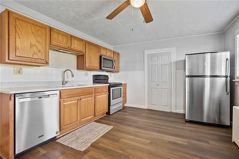 Take a look at this four bedroom, spacious home located on a corner lot. Many updates have been done in 2021 including a new metal roof, high efficiency boiler furnace, hot water tank, beautiful waterproof vinyl flooring on the main level, carpeting with moisture resistance padding on the upper level, new ceiling fans, quartz counter tops, dishwasher and microwave. There is new electrical wiring throughout the entire house with hardwired smoke detectors. The foundation wall under the front porch and the porch floor have been replaced. Off of the kitchen is a large walk-in pantry for additional storage. It comes with a full appliance package including, refrigerator, stove/oven, microwave, washer and dryer.