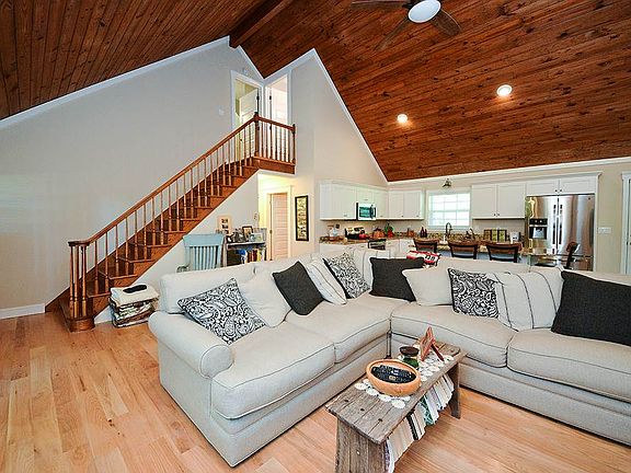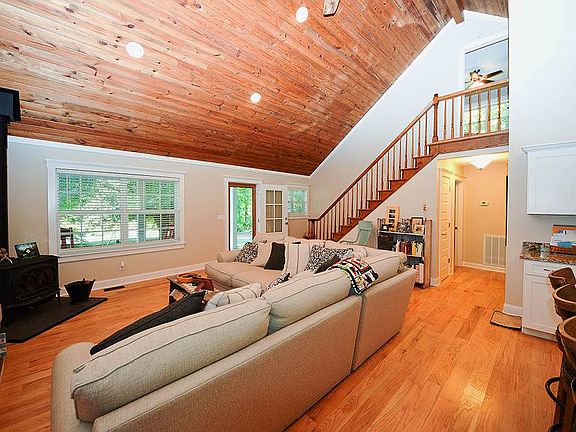 COUNTRY CHIC! Flawless updates throughout this 3BD/2BA home will immediately draw you in. Expansive covered front porch leads to impressive great room featuring dazzling cathedral ceilings, polished hardwood floors, and wood burning Buck Stove, perfect for curling up on a cool winter evening. Open floor plan follows through to the pristine kitchen, boasting granite counters, large island/kitchen bar, and desirable stainless appliances. Main level also holds two spacious bedrooms, one full bathroom, laundry room, and attached single car garage. Second level has one bedroom and bathroom, displaying a trendy tiled shower and modern vanity. Home has been updated with all new windows throughout as well as a new HVAC and more! Established on 1 partially cleared acre, privacy sits at your fingertips. All of the unique features make this house a must see!