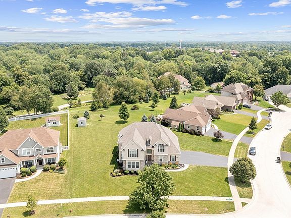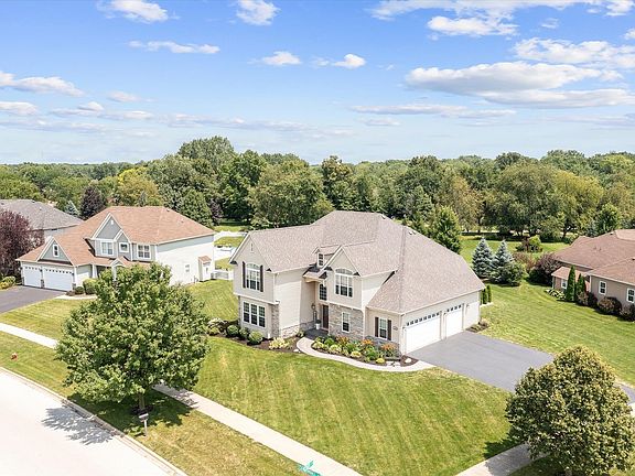 Step into luxury at 1202 Cannon Ball Trail, a home that exudes sophistication and style built by John Paul Builders. As you enter the grand two-story foyer, you are greeted by an exquisite wrought iron staircase, a massive chandelier and exotic teak hardwood floors that set the tone for this magnificent residence. To your left, French doors open to a spacious den, perfect for home office or cozy reading nook. The huge dining room with extensive millwork is designed to accommodate large gatherings, making it perfect for hosting family dinners and holiday celebrations. The two-story family room is the heart of the home featuring a striking fireplace and a wall of windows that flood the space with natural light. The gourmet kitchen is a chef's dream equipped with stainless steel appliances including double ovens, granite counter space for meal preparation, plenty of custom Brakur cabinets for storage, a center island and breakfast bar. Adjacent to the kitchen is a bright and airy area, ideal for casual dining. The second floor boasts a princess suite with private bath, perfect for your princess or guests. The additional bedrooms share a Jack & Jill bath with massive counterspace for dual sinks. The huge master suite is a luxurious retreat, offering a large walk-in closet and spa-like bath with dual vanities, a Whirlpool tub, separate shower and private commode. Additional highlights include a stunning stone facade exterior, a side load three car garage, new stamped concrete walkway and a massive stamped concrete patio ideal for outdoor entertaining and relaxation. Recent updates include: new shed (2023), new roof, new carpet, new fridge. Newer extensive, professional landscaping w/ new patio & walkway (2021), newer paint (2020), newer washer & dryer (2018). Enjoy all the amenities that Yorkville has to offer like the Silver Springs State Park, Fox River, Marge Cline Whitewater Rapids, Forest Preserves, Kiddie Themed Parks, Raging Waves Water Park, the downtown area w/ their yearly festivals and local Shopping & Restaurants! Make this beauty your home today! A++