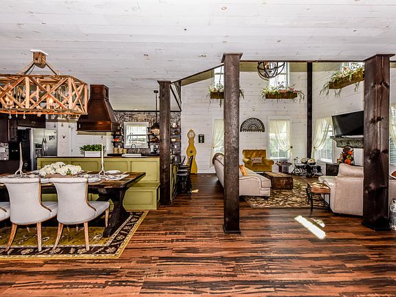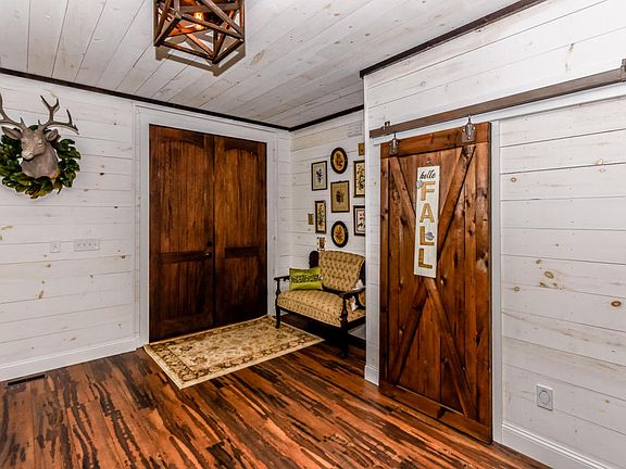 Custom Barn-Style Luxury 4 Bedroom/3.5 Bath Farmhouse with Mountain-View on a fully stocked pond. Inside this must-see home, you will find an open floor plan with extensive hardwood shiplap throughout as well as ten foot ceilings, authentic timber beams, high-end luxury vinyl plank flooring, crown moulding throughout, and much more. In the living room, the two story ceiling with lots of natural light maintains the warmth of home, yet its open floor plan to the dining area and kitchen makes it ideal for entertaining.The kitchen continues the home's character of craftsmanship in its cabinetry, gorgeous open-shelving, butcher block countertops, and hardwood range hood. The large master suite on the main floor boasts a beautifully appointed master bath with a walk in shower wet room with claw