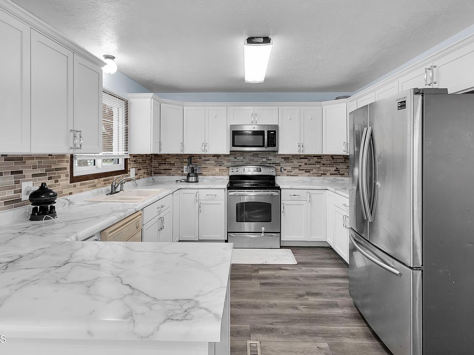 The kitchen has modern-style white cabinets, and all kitchen appliances are included. On the upper level, there are three spacious bedrooms on one leve and full bathroom with dual sinks & linen closet