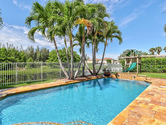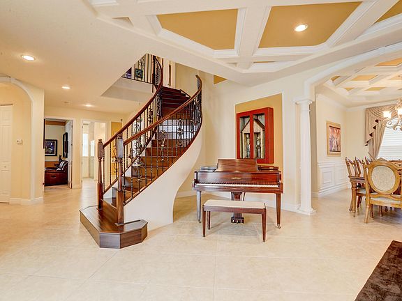 This BEAUTIFUL home located in the gated community of Black Diamond in Wellington is a MUST SEE. This Trillion model (one of the largest models in Black Diamond) home offers a spacious floor plan with over 4000 square feet under air, 4 bedrooms, 4 full bathrooms, with home office, loft with built-ins, game room (can easily be converted to 5th bedroom), 3 car garage, salt water pool and UPGRADES GALORE. Upon entry through the beautiful front hurricane impact doors your eyes will be drawn to the stately spiral staircase, custom tray/coffered ceilings with drywall beams and moulding. Which are found throughout the home in the living room, dining room, master bedroom and game room. Wainscoting in dining area. Gourmet kitchen with granite countertops and island,