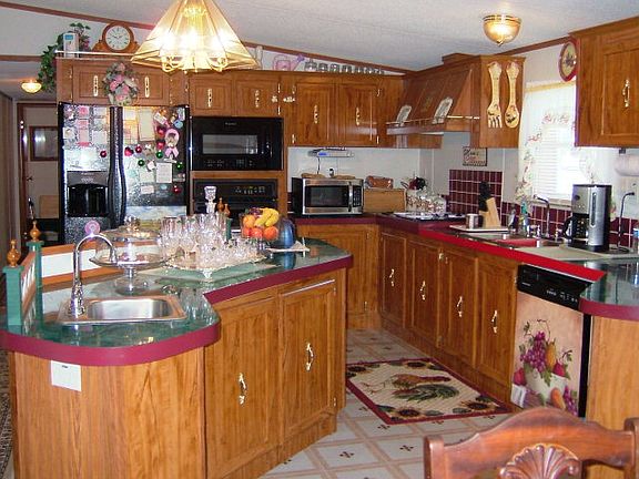 Immaculate 2002 double wide with permanent foundation and tie downs. Offering vaulted ceilings and columns that separate kitchen from living room. Kitchen w/island and some new appliances (s/s refrigerator/oven/microwave/upright freezer/washer/dryer), formal dining with built in TV&Stereo, drapes & blinds stay, some furniture negotiable, KU el. (avg. under $100 per month), 3 bedrooms, 2 baths, central el. heat/air, 2 sheds, corner lot, sunroom.