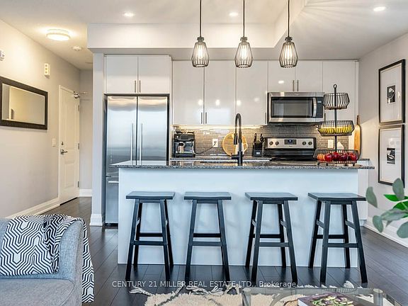This sophisticated 2-bedroom, 2.5-bathroom condo-townhouse, nestled in the desirable Stax on Main, combines modern design with urban convenience. Built in 2018, the 1250 sq.ft home boasts an open-concept floor plan accentuated by quartz countertops, premium Whirlpool and Fisher & Paykel appliances, and expansive side wall windows that flood the space with light. Enjoy the elegance of the pendant and pot lights. Each bedroom offers 9-foot ceilings and generous storage, with the primary suite featuring a 3-piece ensuite and walk-in closet. Additional perks include a laundry closet, tankless water heater, private balcony for serene outdoor moments, and underground parking. Residents benefit from Milton's vibrant community offerings - from farmers markets and leisure centres to the scenic trails of the Niagara Escarpment. With easy access to GO train and major highways, this property is ideal for those seeking a blend of style, comfort, and convenience in a small-town setting.
