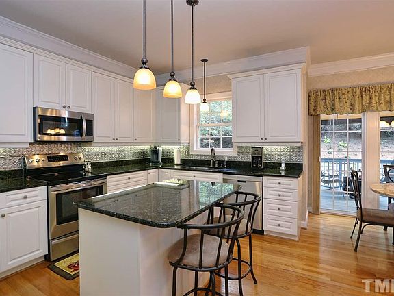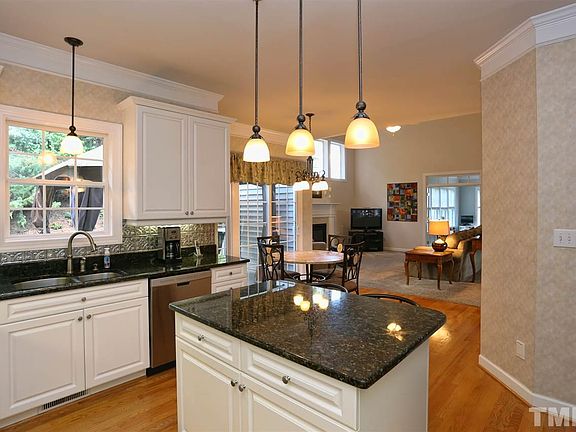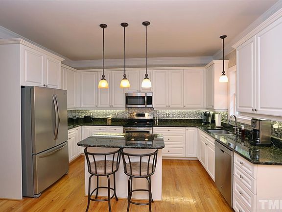Beautifully updated home in desirable & convenient Apex location! Culdesac lot, hardwoods, crown molding, transoms, central vac, unfin 3rd floor walk-up + plenty of storage in unfin basement. Gorgeous kitchen w/ granite, SS, trendy tin backsplash & walk-in pantry! 1st flr office, sunroom, formal dining & family room w/ cathedral ceiling. Master suite has tray ceiling, walk-in closet & huge bath w/ dual vanity, whirlpool & sep shower. Spacious laundry & walk-in closets galore! Covered deck & fenced yard.