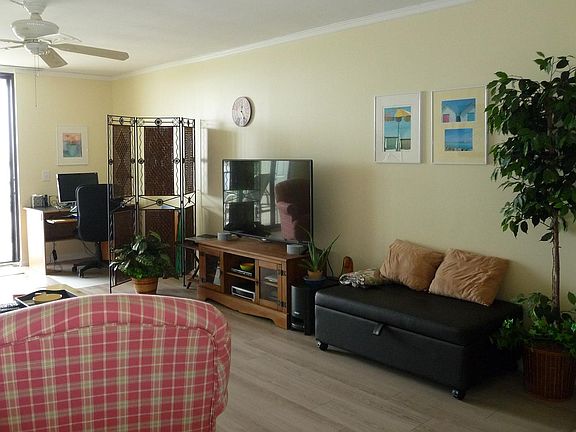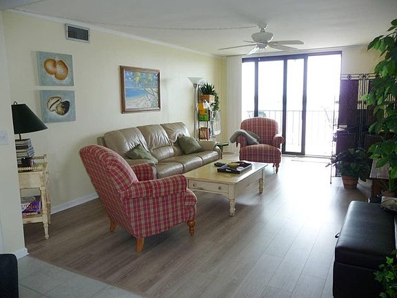 Available ONLY as of May 1, 2022 with a 6 or max. 7-month lease ending on Nov 30, 2022 - Excellent location for off-season extended vacation or relocation stay. Watch the sun rise directly on the intracoastal! Spacious top floor apartment in quiet boutique building with spectacular view. Comfortably furnished/Turnkey with one bedroom w/ king-sized bed (2 twins), second bedroom set up as a den with sofa bed and desk, 2 baths, living room, dining room, full kitchen, washer/dryer in unit. Elevator access. Beautiful pool, common area with BBQ, fishing dock. Great location: 1 mile to beach and close to shopping. Available as of May 1, 2022 and only with a 6 or max. 7-month lease ending on Nov 30, 2022. Owner pays for water. Renter is responsible for electric and TV/internet. Last month rent due at signing. NO smoking. NO pets. 2 assigned parking spaces (no commercial vehicles allowed). Lessee will need proof of income three times the rent and must show "good" credit. Application fees are approx. $250.
