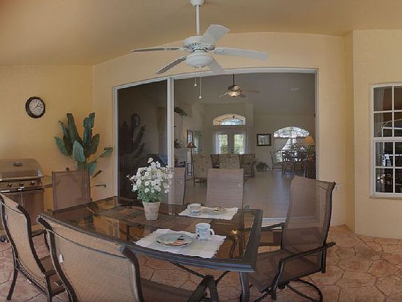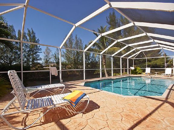 This beautiful pool home on the Carnaval freshwater canal provides a rear west exposure to enjoy the afternoon sun and the gorgeous sunsets of Southwest Florida. Built in 2005 it features 3 bedrooms, 2 bathrooms (one serving as a pool bath), a large den/office/library, a 3-car garage, tile roof, stamped driveway and pool deck, huge pool area across whole width of the house with oversize pool, electric pool heater, granite counter tops, upgraded cabinetry, tiled throughout all areas with exception of bedrooms which have laminate. With the high vaulted ceilings it gives a lot of volume. One guest and the master bedroom have french doors to the pool area, the master bedroom and the den have french doors to the living room as well. The master bathroom has split double vanities and a separate tub and shower. Enjoy the relaxing view from the spacious lanai down the canal. This home invites for outside entertainment with the spacious areas around the pool. The home is located in a wonderful and emerging neighborhood with no thru traffic yet close to schools, playgrounds, shopping and restaurants. Less than a minute out to Chiquita Blvd and then to Pine Island Rd.