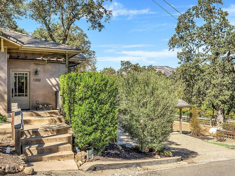 Charming stucco home built in 2013 with beautiful views of vineyards and eastern hills between Calistoga and St. Helena. High ceilings, wood floors, plaster walls, refined finishes, tiled bathrooms, frameless glass showered walls. Home has a beautiful European feel with an open floor plan. Large Master bedroom with ensuite master bath. Glass doors out to back patio with landscaped gardens around the house. Modern kitchen opens to Living Room. Bonus room with ensuite full bath is off Living Room. Storage building next to 2 gravel parking spots. This is a beautiful contemporary home with wine country views.