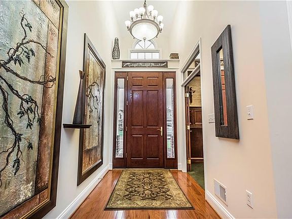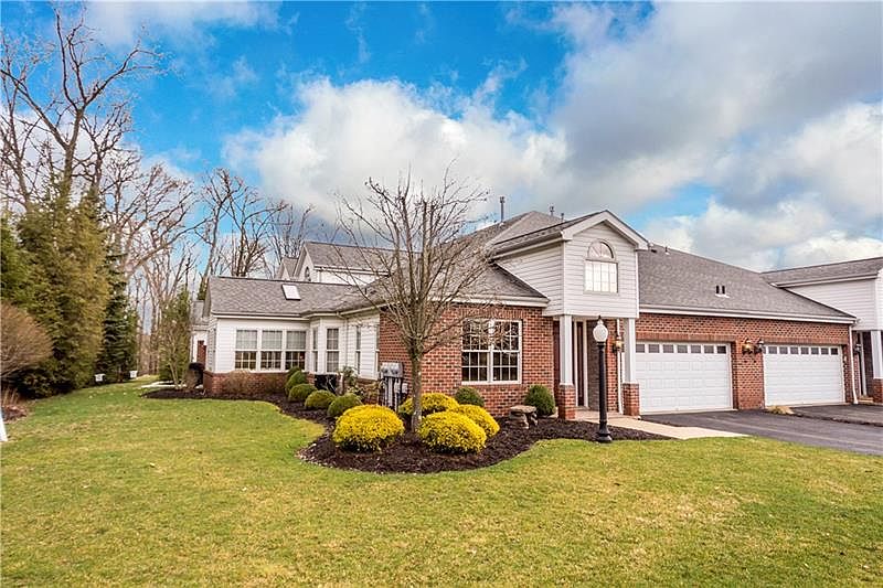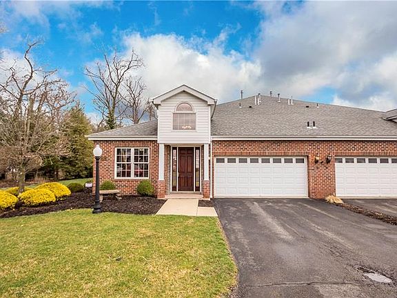 STUNNING move-in ready 1st floor master carriage home in Adams Crossing with significant upgrades! Warm and inviting, this home has been exceptionally well-maintained. Gourmet center island kitchen with granite counter tops, stainless steel appliances, tumbled marble back splash, under & above cabinet lighting. Morning room off of kitchen w/ skylights. Dramatic two-story great room w/ beautiful coffered ceiling & library loft, drybar w/ wine cooler, imported stone gas fireplace, home entertainment system w/ surround sound and perfect sized TV included. Wood paneled office w/ built ins & coffered ceiling. Lovely master bedroom, his & hers closets, upgraded ensuite w/glass enclosed shower & bench, double vanity and soaking tub. Hand painted walls & included art installation in entry. Laundry w/ folding area. Private patio. Newly stained front door. Close to Rt 8 & Cranberry Twp. shopping, restaurants, and entertainment. Remote video tour possible.