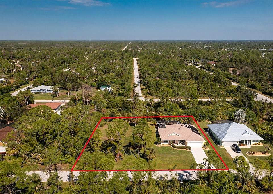 YOUR ABSOLUTELY STUNNING FULLY FURNISHED "FLORIDA DREAM HOME" AWAITS YOU ON A DOUBLE LOT (1/2 ACRE) WITH A BEAUTIFUL VIEW OF MAJESTIC TREES, CREATING A PEACEFUL AND PRIVATE OASIS. The well appointed home features a new roof, three bedrooms, two bathrooms, and an oversized patio with a screened in saltwater heated pool where you can take in the beautiful Florida lifestyle. As you walk into the home you will be greeted by a well designed open concept that is light and bright with vaulted ceilings that flows effortlessly from the formal dining room, living space, eat in kitchen and through the sliders to a beautiful pool and lanai area. The split floor plan creates ultimate privacy for you and your guests or family members to have their own quiet retreat. The spacious owners suite with lanai access includes and en-suite bath featuring granite vanity, a newly designed shower, double sinks and expansive closet space. The kitchen boasts granite counter tops a large pantry and stainless steel appliances. The home features various upgrades, a NEW ROOF 2023 with new Gutters and Facia, RO SYSTEM 2022, Pool Pump 2022, Salt System 2023, Septic System 2021, Skylight in the Living Area 2021, Master Bedroom Shower 2020 and carpet in 2023. The home is also hurricane protected with all impact windows and accordian hurricane shutters in the lanai to protect your outside furnishings. The DOUBLE LOT is beautifully appointed with impeccable landscaping. The lot can be used for a second garage, a second home, RV storage, guest cottage the possibilities are endless. In addition to the Double Lot the Lot across the street (MLS#D6133240) is also available for $20K. You could have 3 lots, a beautiful home with a heated pool and all the privacy and opportunity you would want for under $500K. SERENITY AWAITS! DON'T MISS THIS OPPORTUNITY, THIS HOME WON'T LAST LONG! *List of Furnishings are available on the MLS*