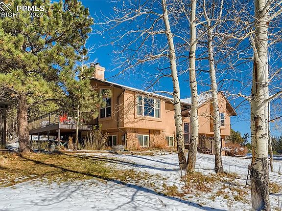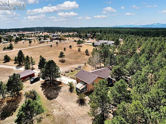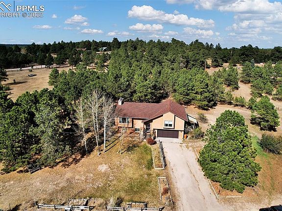 Great home located on five treed acres in eastern Black Forest. Three bedrooms, three baths, vaulted living room, lovely office area with built ins, plus a family room, this home checks all the boxes. Mature ponderosa and set back off the road offers for great privacy plus two storage sheds of which one could work as a hobbyist outbuilding or barn conversion. The home features lovely tongue and groove ceilings, a remodeled kitchen, newer stainless appliances, and three main level bedrooms. The downstairs garage is oversized with lots of storage. There is also an additional four season sunroom perfect for winter blues and plants. The large composite deck off the west side of the home overlooks gorgeous gardening and plantings, plus a pergola, and double ponds with stair stair stepped water fall. Outdoor living at its best and so pretty! Lots of terracing and stone decorations make this the place to be. Other amenities are newer roof and newer stucco. Woodlake subdivision also features riding and walking easements, the three mile County Park Trail, also close to Homestead Regional Park for riding and hiking. Quick commute to Falcon for all shopping and restaurants and easy commutes to Springs and Denver. Come and enjoy!