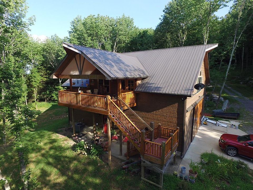 This Swiss chalet style home includes hand hewn wood siding, open floor plan, granite countertops, custom hickory cabinets and doors, western cedar throughout, solid wood beams, custom barn doors going in to basement, stone gas fireplace, 2 x 6 framing, large closets, attic space. Property is fully fenced and includes 2 spring fed ponds. Enjoy woods behind the house and a road that goes to the back of property into 2 open fields. 644 sq ft bonus room in basement and includes large hot tub.