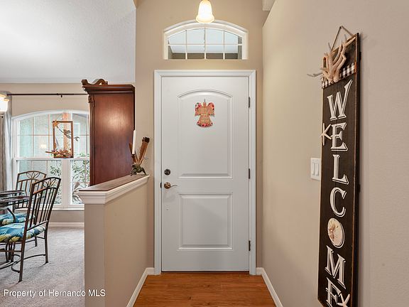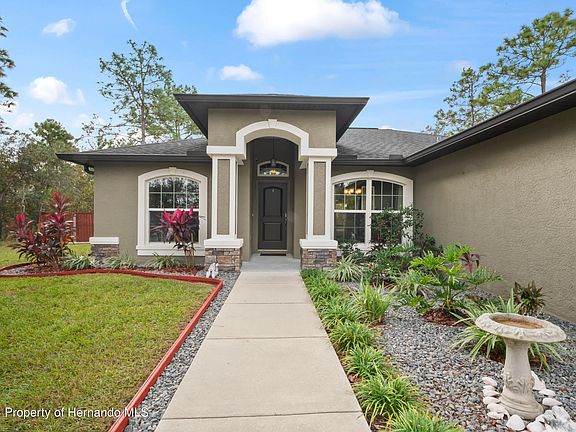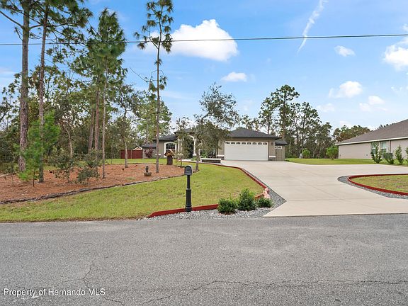 Situated on a picturesque 1/2-acre lot in the Royal Highlands, lies this exquisite, meticulously maintained 3-bedroom, 2-bathroom, 2-car garage Pastore Custom home, built in 2017. The open split bedroom floor plan features an Owner's suite with a private ensuite bathroom and spacious walk-in closet. The eat-in kitchen includes all appliances, pull-out drawers, pantry, and built-in TV. A breakfast nook with bay window brings in natural light. Additional features include a formal dining room, large great room with glass sliders leading to the 19x11'10-foot Lanai under truss overlooking a fenced-in backyard and backyard brick paver patio. Inside laundry closet includes washer and dryer. This home exceeds new construction standards, offering UV-tinted windows, driveway with turnabout or extra parking, master bath comfort height toilet, second bath shower handrails, LED spotlights in backyard, cedar privacy fence, built-in air compressor, AC garage, insulated garage door, foam-filled walls, ARLO security, smart switches, rain gutters with leaf guard, lower kitchen cabinets roll-out racks, LED fixtures, built-in USB charger outlet, and TV in kitchen. Backyard Shed/workshop, side yard storage shed for trash cans and compressor, plus more backyard storage for your riding lawnmower and other yard tools. A must-see garage if you are a car enthusiast. Average electric bills range from $90 in winter to $125 in summer. Enjoy great-tasting well water, eliminating water bills. Some furnishings available upon request. Home is located in a USDA financing area. The Royal Highlands is 10 minutes from Weeki Wachee Springs state park, the Gulf of Mexico and 20 minutes from Three Sisters Springs where the spring water temperature is 72-74 degrees year-round and you can enjoy a day of kayaking, boating, Jet skiing, and swimming with the Manatees.