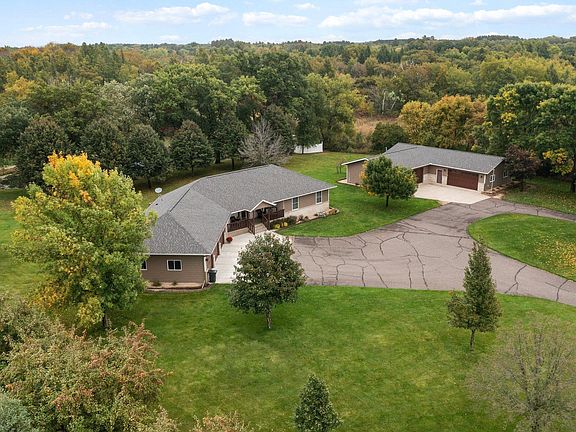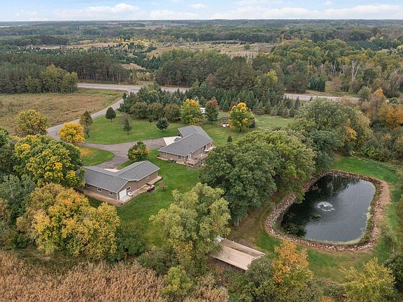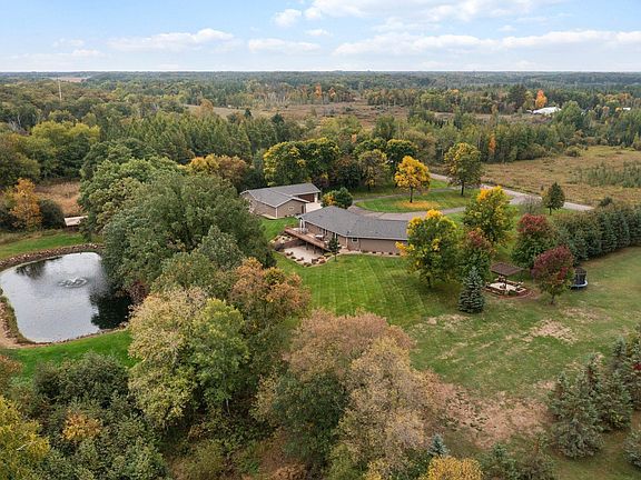 Remarkable setting hosts this quality crafted one owner home on 16+ acres. A place for everyone, the custom built home boasts a 3 stall attached garage, 5+ stall accessory garage, and a lower level salon. Front porch welcomes you, inviting you in to a open concept main floor with vaulted ceilings and a window scape that calls you to the gorgeous back yard setting. Main level has kitchen, dining and living converged as a gathering space accented with a beautiful fireplace. Find 3 same floor bedrooms with the owners suite offering a private bath and access to the deck. Mudroom/laundry off of the garage with a convenient 1/2 bath too. Lower level hosts additional bedroom, large family room with 6 seat bar, flex space and an enormous cold storage area. Outdoor space enjoyment is fully realized with the wooded acreage, landscaped fire pit, pond with fountain and all the garage space for your work and play. See additional remarks on professional photos.