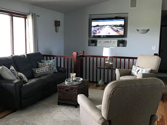 This beautiful 4 bedroom and 4 bathroom home sits on 1.5 acres just east of Apple Creek Country Club. The maintenance free front porch welcomes guests to this gorgeous home. The main level features hickory hardwood flooring. The kitchen has gorgeous cherry cabinets, a large center island and granite counters. There are beautiful solid cherry doors and trim throughout the rest of the home. The main level also has a large master bedroom, huge master bath with a tiled shower for 2 and a walk-in closet. There is also 1 more bedroom, full bath and a 1/2 bath with laundry. The basement features a large family room with a fireplace, 2 large bedrooms and a bath. Just off the family room is a large recently finished room that would make a great theater room, game room or fabulous storage ( if needed, a window could be added to make this room a bedroom). The oversized 1380 sq ft 4 stall garage is completely finished with heat, water and 4 floor drains. There is a door to the 4th stall on the west side of the house where the RV pad is. Connected to the back side of the garage is a shop with a loft. The air compressor is included! The camper pad beside the house also has full hookups, a RV dump and 50 amp service. There is also very economical Geo Thermal heat with winter cost of $64 at the highest. A radon mitigation system is already in place! There is a well for the 12 zone sprinkler system. There is audio throughout the home and the inside equipment stays (garage components excluded). There is a large covered and screened in deck. This is a very quality built home. There are plug-ins both inside and outside in the evergreens for Christmas décor! On the east side of the home there is already a gravel driveway for a future shop!