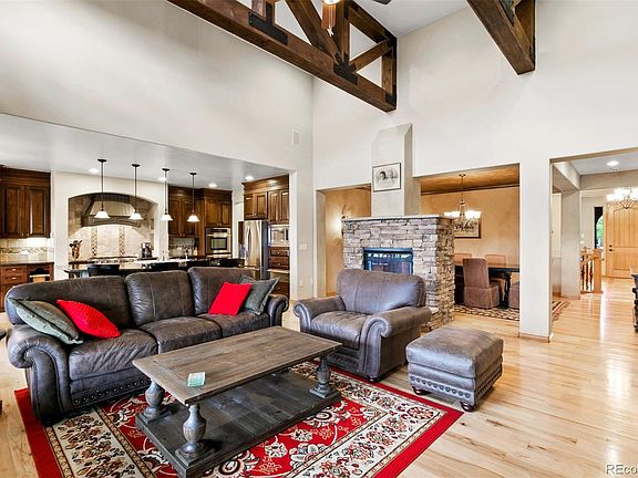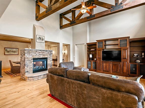 This spacious, former model home in Canterberry Crossing offers an open floorplan and upgrades throughout. A welcoming grand entrance leads to the massive great room, ideal for entertaining. The living room features 18-foot ceilings accented by stunning wood truss beams, and a see-through fireplace connects the living room to an intimate dining space with hammered copper-look ceiling. The chef's kitchen includes a six-burner gas stove, double ovens, granite counters, casual eat-in area and large island with ample room for seating. On the main floor, you'll also find a study that's ideal for working from home, plus two bedrooms, two bathrooms and a fantastic master suite with a walk-in closet and private, five-piece bath. A spacious covered deck off the eat-in kitchen area provides a quiet place to relax and enjoy golf course views. Head down to the walkout basement to discover even more room, including a huge rec space, fireplace, bar and wine cellar, plus two more bedrooms and a full bath. Then step out to a covered patio area with gas fireplace and low-maintenance yard. The HOA takes care of outside maintenance (paint, mowing of front and back yards, snow removal, and trash), leaving you more time to enjoy the community pool, tennis courts, or play a round of golf at nearby Black Bear Golf Club. This home has it all!