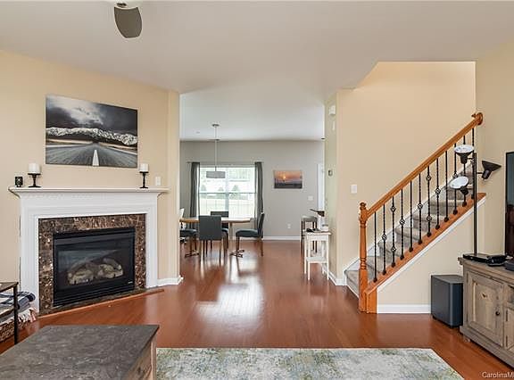 Hurry this beautiful 3 bed/2.5 bath END UNIT townhome will not last long. This well maintained townhome features hardwoods on main floor, neutral paint colors throughout and plenty of windows for natural light. A large and updated kitchen features granite countertops and matching black stainless steel appliances. Refrigerator is included. The Kitchen has a large island and opens up to the dining area with convenient access to the back porch, perfect for grilling out or entertaining. The outdoor space is one of the best and most private lots in the neighborhood. The community green area is right out back so yard feels very private. Large master upstairs with vaulted ceilings. 2 additional spacious bedrooms upstairs. Attached 1 car garage and extra long driveway accommodating up to 3 cars. Awesome location with easy access to shopping, dining and 485.
