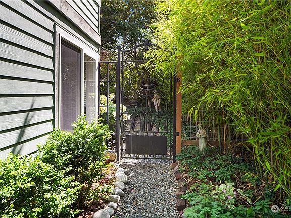 These owners built and designed a unique home with lovely gardens. The main living spaces are on the upper floor, including the living room, kitchen, and primary bedroom to provide some privacy, capture the light and give it a perch like feel. On the ground floor there are 2 bedrooms, a full bath, and entrance to a 1 car garage and utility space. In the early 2000’s the owners built 2 bonus space on the west side of the home. The room built off the kitchen has vaulted ceilings and plenty of light, it could be used as a dining room or an extra living space. On the main level the owner used the bonus room as an arts & crafts space and it has its own side entrance, The real love went into the gardens, even designing the gate to walk through.