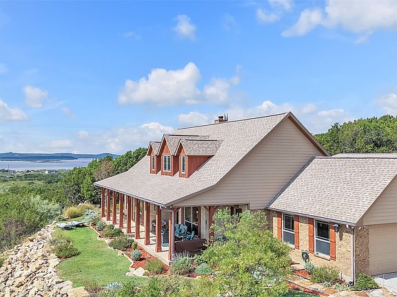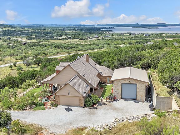 Perched high above the lake in the scenic Hills of Possum Kingdom, this private and secluded retreat offers breathtaking views and serene living on 4 acres of natural beauty. Enjoy lake vistas from multiple patios and an open-concept living, dining, and kitchen area designed for effortless entertaining. The kitchen features brand-new GE Café appliances, a spacious butler’s pantry with abundant storage and a versatile coffee bar. A wood-burning fireplace adds cozy charm, while the laundry room conveniently connects to a two-car garage. The master suite is a true sanctuary with patio access, a large walk-in closet, and a spa-inspired ensuite boasting a luxurious jacuzzi tub. Two additional bedrooms each offer walk-in closets and share a full bath. Outside, a 23x32 shop with pass-through overhead doors and blow-in insulation presents endless possibilities—convert it into extra living space, a bunkhouse, or a hobby haven. This property blends comfort, functionality, and potential in a stunning lake retreat.