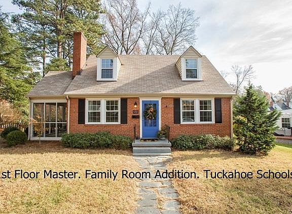 Tuckahoe Schools! Adorable brick cape w/many unexpected surprises including a 1st FLOOR MASTER w/attached full bath & HUGE family room ADDITION! Larger than your typical cape w/1952 sq ft, 4 bedrooms & 2.5 baths. Plus all the charm & character you expect along w/ the modern conveniences you love including REPLACEMENT windows (2017), screen PORCH, HARDWOOD FLOORS throughout, classically designed living room w/wood burning FP, crown molding & the cutest built-ins ever & timeless dining room w/updated chandelier & chair rail. Bright & Sunny kitchen w/GRANITE, stainless, gas cooking & even a PANTRY! The family room addition also has a FP (relined in 2011!) w/gas logs, built-ins, ceiling fan, recessed lights & door to the deck and backyard. The master suite addition has 2 CLOSETS & private bath with a tiled shower stall and tile floor (super cute). There is another bedroom with half bath on the 1st floor (or perfect for a home office). The 2nd floor has 2 bedrooms & another full bath with tile floor and tub/shower with tile surround. Fenced yard with deck and shed. Roof 2013. Heat pump 2010 (radiators no longer in use/needed. FIOS. Gas is connected at the HOUSE! This is a must see.