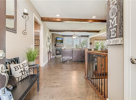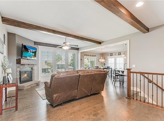 Why buy new? Bring an offer! This newer home features custom plantation shutters throughout, stone fireplace, wood floors opening to kitchen and dining room. Granite counters with stainless steel appliances, gas stove and pantry. Large Master Suite with vaulted recessed lighting, plantation shutters and Master bath has granite counter top double vanity, walk-in closet, large tub and tiled shower. Walkout Lower level offers a large recreation room with a projector & movie screen perfect to watch Chiefs games or for the movie lover. The family room walks out to the 26x24 lighted basketball court with an adjustable Goalrilla Goal or just use as a huge patio, plus grill burgers from the deck that walks out from the kitchen overlooking the patio. There are two bedrooms and an office in the lower level or could be used as a 4th bedroom. Additional 27x10 space to finish for more sq/ft or just use for storage, has its own private door to outside that would also be perfect for a workshop. Professional landscaping surrounding the house with rock and concrete edging. Home has so much to offer!