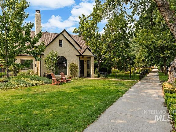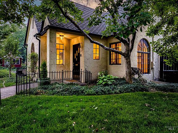 Remarkable home in Boise’s coveted North End seamlessly blends historical charm with modern upgrades! Stunning kitchen features slab granite, penny tile backsplash, commercial-style dual oven, gas range and hood, pot filler, prep sink and appliance cabinet. The living room is warmed by a beautiful fireplace, hardwood floors and leads to a versatile office/flex space. Mediterranean flair throughout with stucco exterior, arched entries and iron-clad windows, shutters, and elegant marble, stone, and tile accents. The cobbled stone courtyard is an entertainer’s dream, complete with hot tub, heated covered patio, and additional living area with cozy fireplace. An expansive primary suite offers vaulted ceilings and ensuite with separate shower and soaker tub, and cedar-lined closet. Lower level extends the living space with another bedroom, full bathroom, a bonus room, and sauna—perfect to unwind after a long day. Desirable corner lot, with convenient access to downtown, Hyde Park, foothills trails and restaurants.