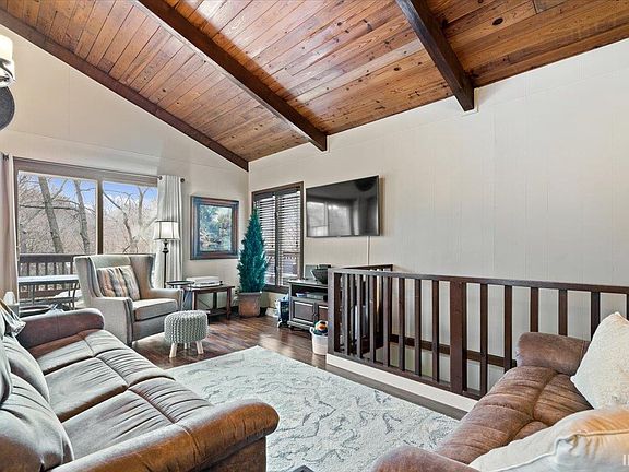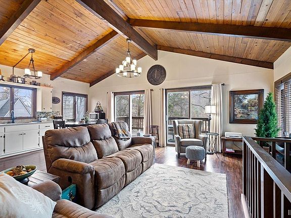 Cabin or home on Idlewild Lake is the perfect place to gather. With 912 Sq. Ft. and a full basement that walks out to a porch, you can enjoy all the Holidays together. This 2 bedroom home offers many updates including a new kitchen with granite countertops and all stainless steel appliances. The Kitchen/Living room is one big space with the 2 bedrooms off the back. Full bath offers a stackable washer and dryer which is included. The view from the main floor deck overlooks the lake. Down by the lake, the new owners have their own private deck. Lower level has a fireplace with electric logs and walks out to an included hot tub. Subject to new buyer filling out application form and being accepted by the board. Land is rented and not owned! Septic tank installed aprox. 7 years ago.