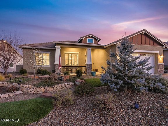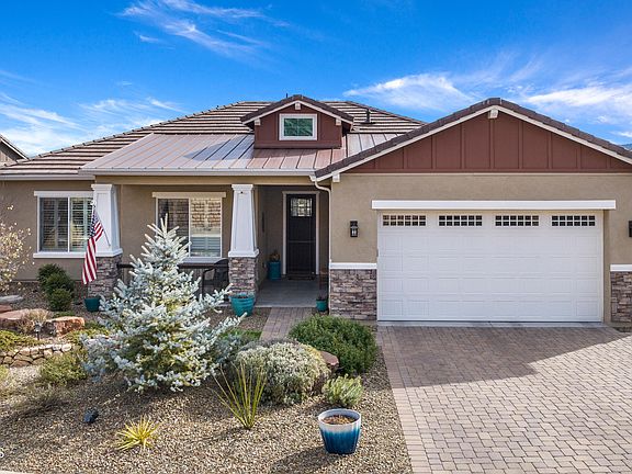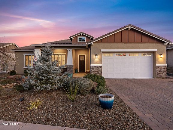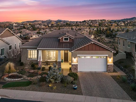This highly upgraded Dorn home is located in the gated neighborhood of Solstice Ridge within highly desirable and amenity rich Prescott Lakes master planned community! Situated on an elevated lot bordering the 8th fairway of the Hale Irwin designed private golf course with stunning views of the course as well as Bradshaw and Mingus Mountain ranges, Glassford Hill as well the Granite Dells, this home has outstanding curb appeal, low maintenance stucco exterior with stacked stone accents, tile roof, paver walkways, patios and driveway and beautiful landscaping front and rear. Upon entry you're immediately impressed by the 12' slider in the great room showcasing the views, soaring vaulted ceilings, and custom added casement/woodwork throughout. The massive great room boasts a corner fireplace