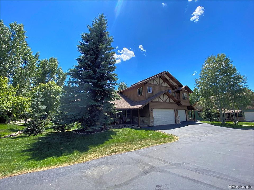 A rare oasis in the mountain area! Nestled on a peaceful street most people haven't been down, sits a lovely townhome that is surrounded by mature pine and aspen trees, flourishing landscaping, and views of the Steamboat Ski Area and Emerald Mountain from outside. This 3 bedroom/3 bathroom home features a convenient 2-story floor plan with vaulted ceilings and a wide-open feel. The kitchen has updated stainless steel appliances, hardwood floors, granite tile countertops, and an eat-in breakfast bar. This townhome offers ample room for friends and loved ones, including a bedroom and full bath on the main level. Upstairs you will find a very spacious master suite and an additional bedroom--both with an ensuite. The comfortable deck and patio with a retractable awning is perfect for summer grilling, and the covered front porch is a great spot for reading or sipping coffee in the mornings. Don't miss the large yard for a townhome, thriving garden and your own private hot tub! The oversized 2-car garage has extra space for storage, while also keeping your cars warm and snow-free in the winter months. With no vacation rentals and its location on a quiet street, this property serves as a tranquil retreat in the mountains.