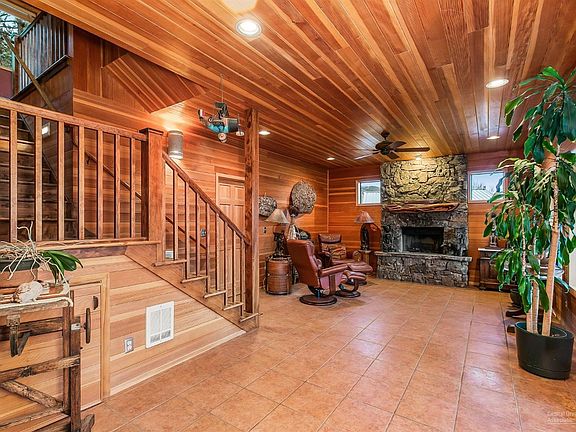 A paver walk leads you to this stunning Northwest style home w/tongue & groove wood ceilings & walls, tile floors w/radiant heat & wood plank flooring. Propane FP puts out a surprising amount of heat & family room has wood-burning stone FP w/Juniper mantel that will knock-your-socks-off! Under stair wood storage means you won't track up your beautiful wood floors w/debris! Large dbl doors open to a covered, stamped-concrete patio. The master en-suite is to die for, w/picture windows that open to an unsurpassed view of the Crooked River Canyon, as a plethora of color dances across the rock walls! The 4th bdrm is large & makes the perfect den, office or hobby room, w/exterior door. Home is hot tub ready, on a secluded & private covered patio. Backyard is completely fenced for critters or garden. The oversize dbl garage has insulated & heated office . To top this off is the 720 SF insulated shop, w/mezzanine storage, concrete flrs & power, plus 50-amp RV hookup! Call today!