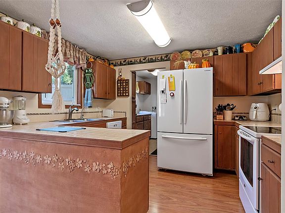 Stairless and affordable living on a walkable lot. The inviting living room offers a pellet stove insert and rock wall to add to the ambiance. The adjoining dining space has a counter area overlooking the living area and has a patio door for patio and grill access. The kitchen offers newer appliances and flows into the laundry area featuring a pantry, storage cabinets and garage access. All 3 bedrooms are oversized. The 1st one overlooks the front yard. The middle bedroom has private access to the full bath. This bath features a separate tub/shower and dual sinks. The 3rd bedroom is the master which offers a full bath with a rock surround. There are also 2 crawl spaces and a shed in addition to the 2 car garage with workbench area. The whimsical back yard offers gardens, a gazebo for outdoor dining and real yard. Easy access to 285 (no noise).